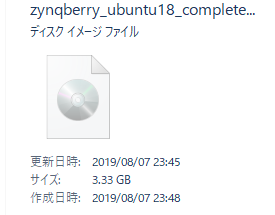 このイメージファイルはzynqberry_ubuntu18_complete.imgという名前で、約3.3GByteのサイズがあります。