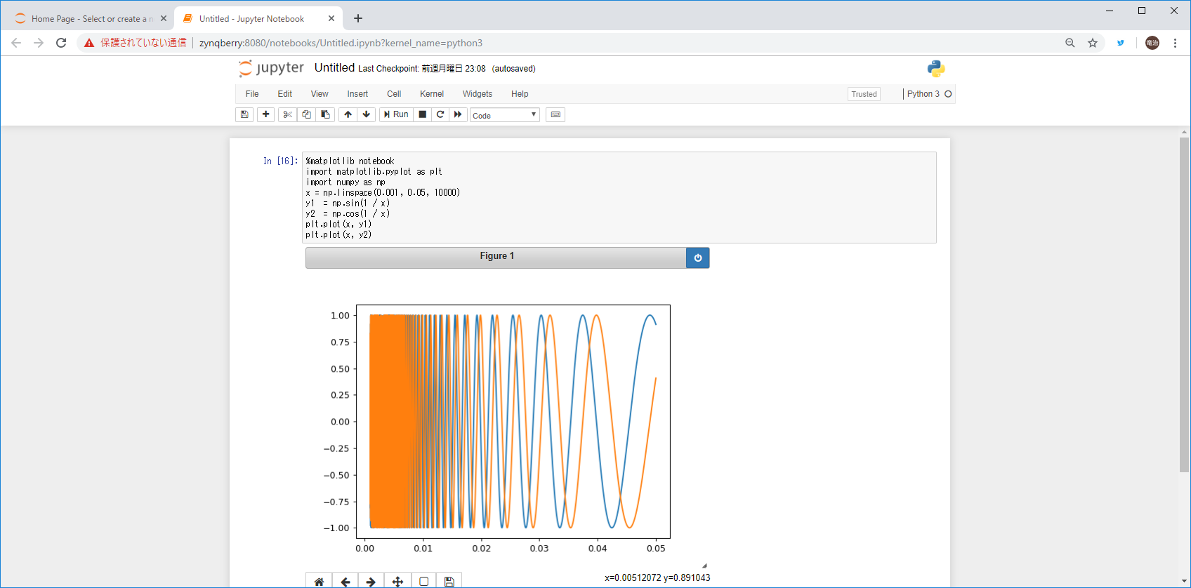 Jupyter notebookなので、グラフの一部を拡大したり、回転したりすることもできます。