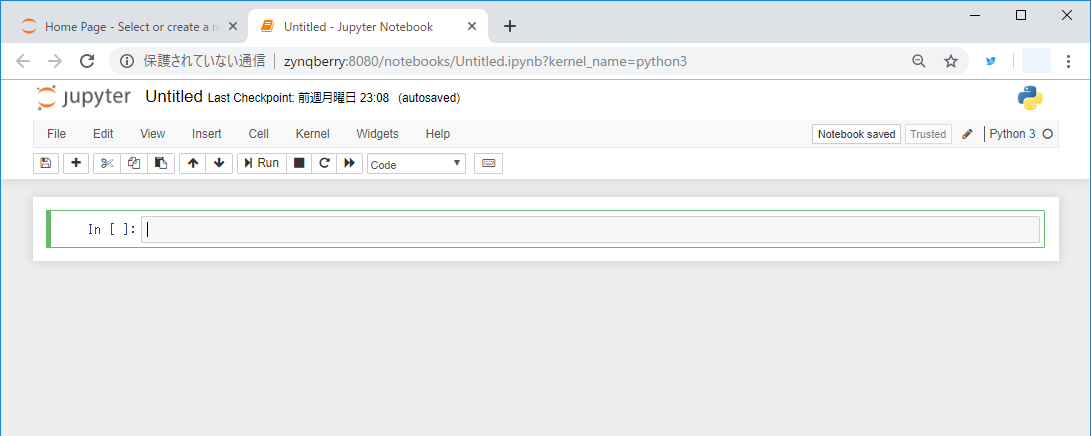 JupyterのPython入力画面が開くので、ここにコードを入力して実行してください。