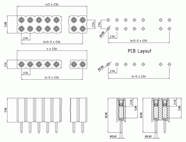 精密メスヘッダー、ストレート、2.54mmピッチ、単列、20ピン、7.0 mmプロファイル、TE0722用熱可塑性プラスチック製絶縁体