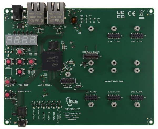 Trenz Electronic CR00109 は、Intel Cyclone 10 LP と 5 つの CRUVI LS、CRUVI HS、および CRUVI HS & ブート コネクタを統合し、新しい CRUVI 規格 (www.cruvi.com) に従って設計された CRUVI 開発ボードです。