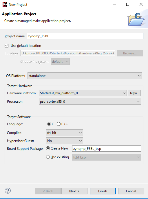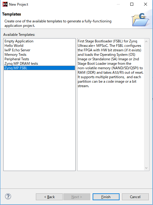 Zynq MP FSBLを選択し、Finishをクリックします。自動的にビルドが始まり、Debugフォルダの中にzynqmp_FSBL.elfが生成されます。
