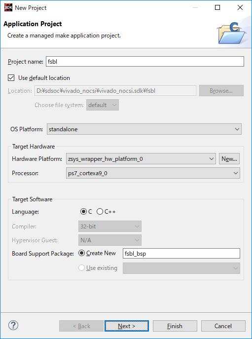 ダイアログが開くので、Project nameにfsblと入力し、Hardware Platformがzsys_wrapper_hw_platform_0になっていることを確認し、Nextを押します。