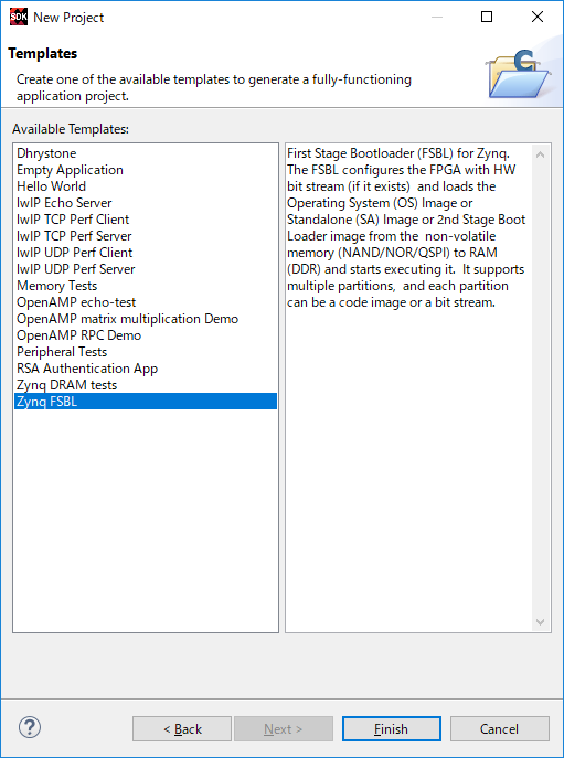 New Projectダイアログが開くので、Zynq FSBLを選択し、Finishを押します。