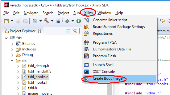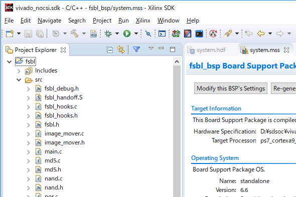 Trenzのサンプルプロジェクトに含まれているsw_lib\sw_apps\zynq_fsbl\srcフォルダにあるTrenz製のfsblソースを、D:\sdsoc\vivado_nocsi\vivado_nocsi.sdk\fsbl\srcフォルダに上書きコピーします。