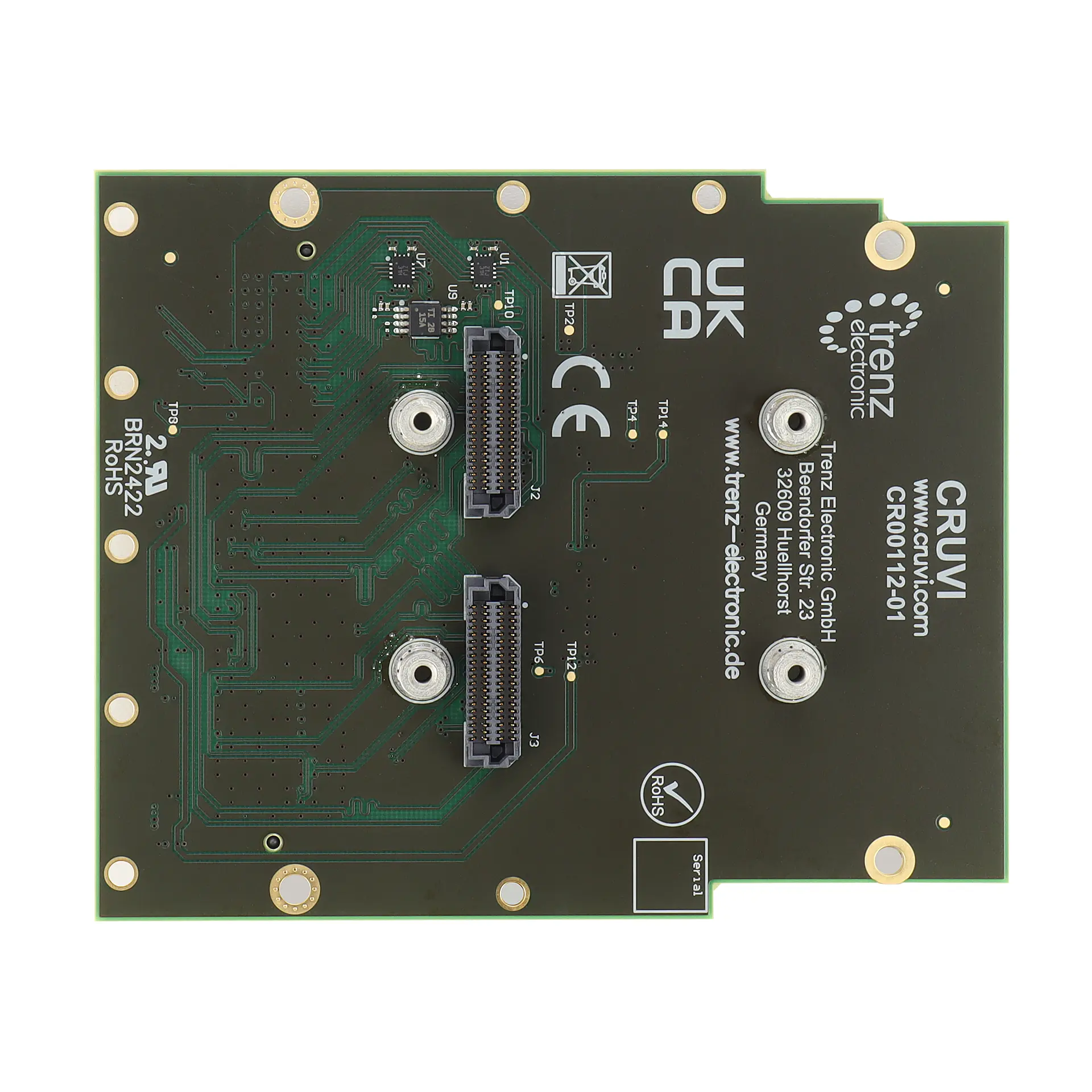 The Trenz Electronic CR00112-01 is an FMC adapter for dual CRUVI modules with Multi-gigabit speed connectors.