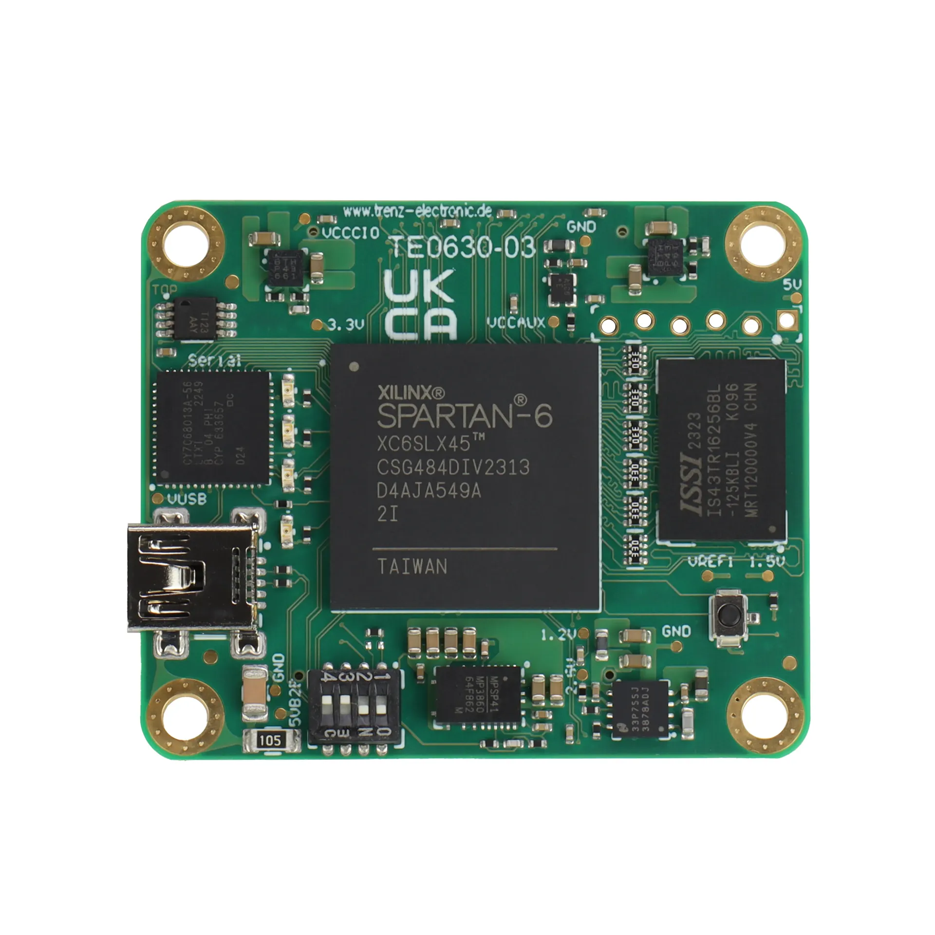 The Trenz Electronic TE0630 are industrial-grade FPGA micromodules integrating a AMD Spartan™ 6 FPGA, a mini-USB 2.0 device port, 4 GBit (512 MByte) DDR3L SDRAM with 16-Bit width, 8 MByte Flash memory for configuration and operation, and powerful switch-mode power supplies for all on-board voltages. A large number of configurable I/O's are provided via rugged high-speed stacking connectors. The TE0630 are fully mechanically and largely electrically backward compatible with Trenz Electronic TE0300 AMD Spartan™ 3E FPGA micromodules.