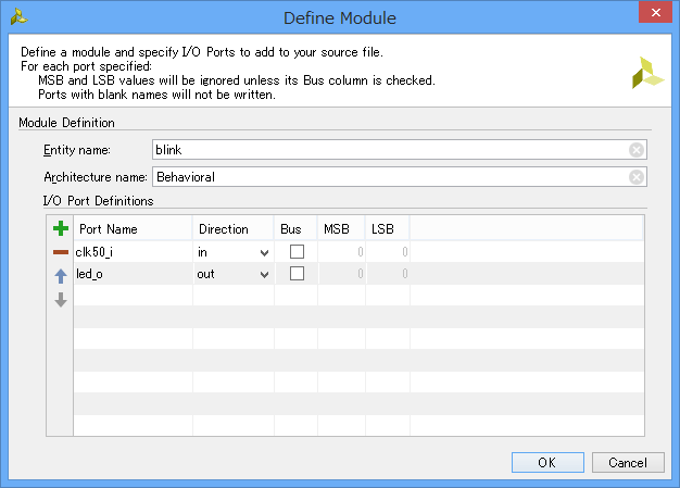 Entity name と Architecture name を入力し、I/O Port Definitionsは下表のように設定してください。