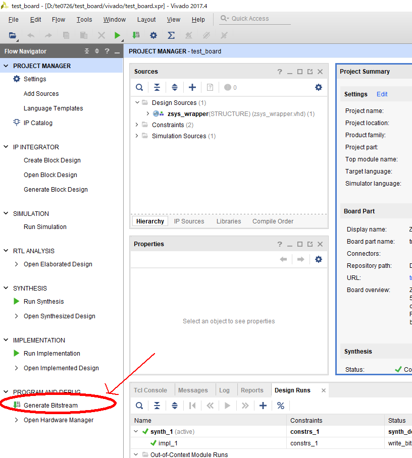 通常のVivadoプロジェクトのように、Vivadoでxprファイルを開き、Generate Bitstreamを行います。