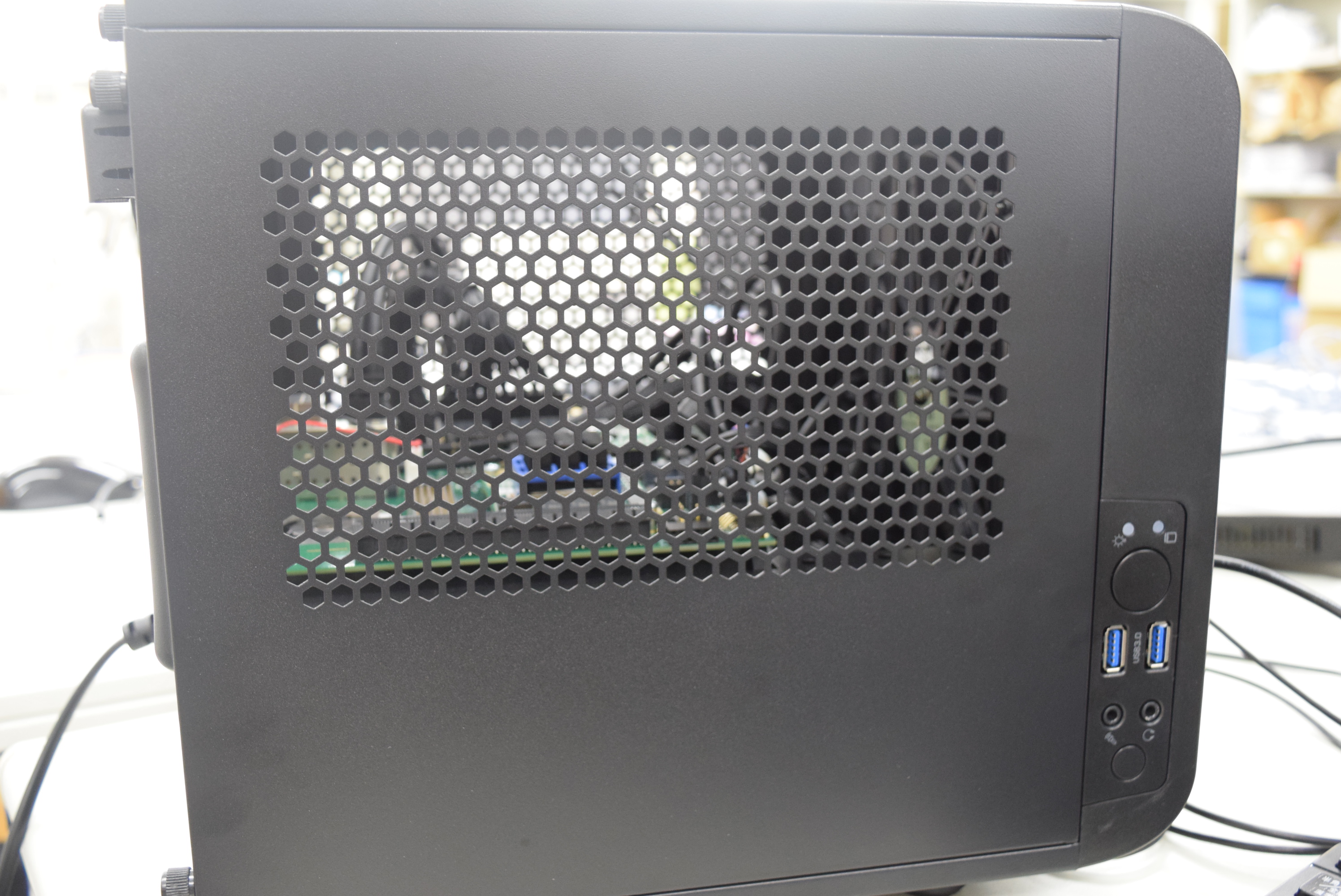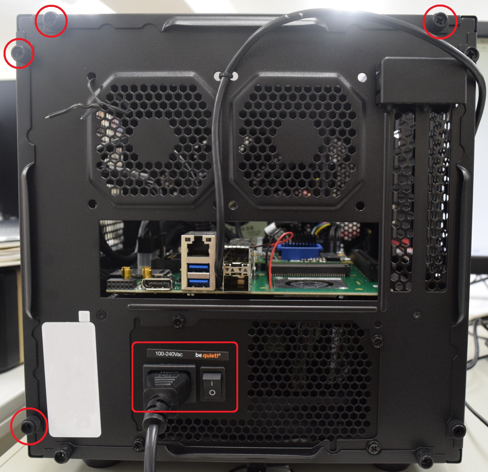 まずは筐体がきちんと動作するかを確認します。筐体の裏側に、メイン電源コネクタとメイン電源ケーブルがついていることを確認します。図の4か所のネジを外し、天板とサイドの蓋を外します。