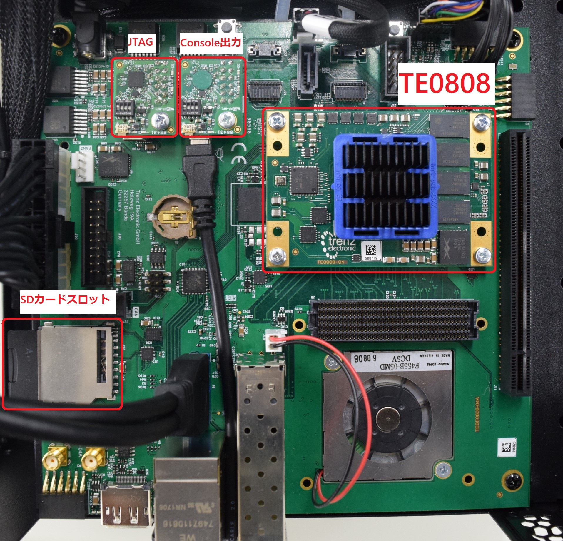 Console出力とPCをUSBケーブルでつなぎます。JTAGとPCをつなぐことで、VivadoのHardware Manager上でZynqMPチップが認識されるようになります。SDカードにブート可能なファイルを入れ、電源を入れることでZynqMPを起動することが可能です。