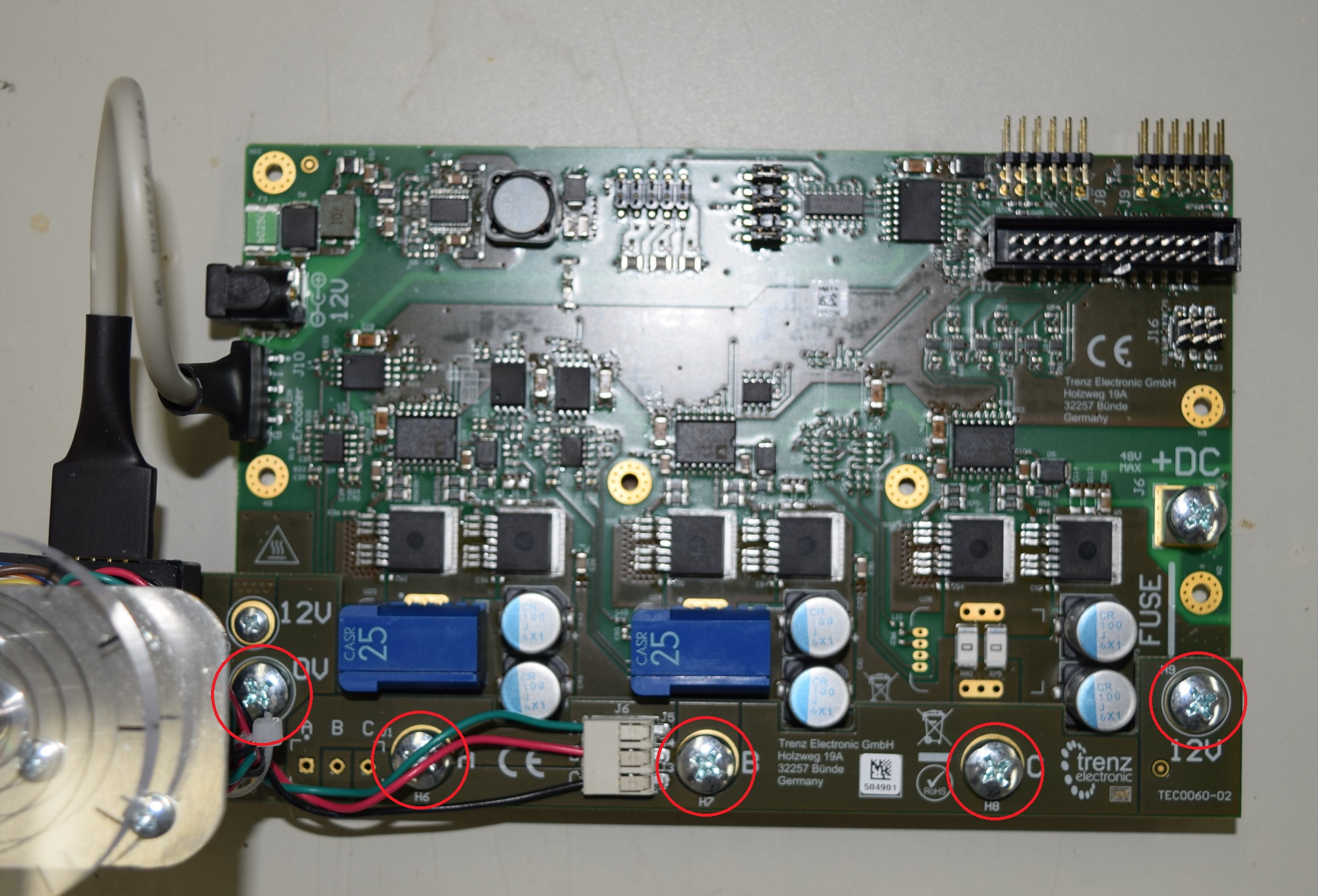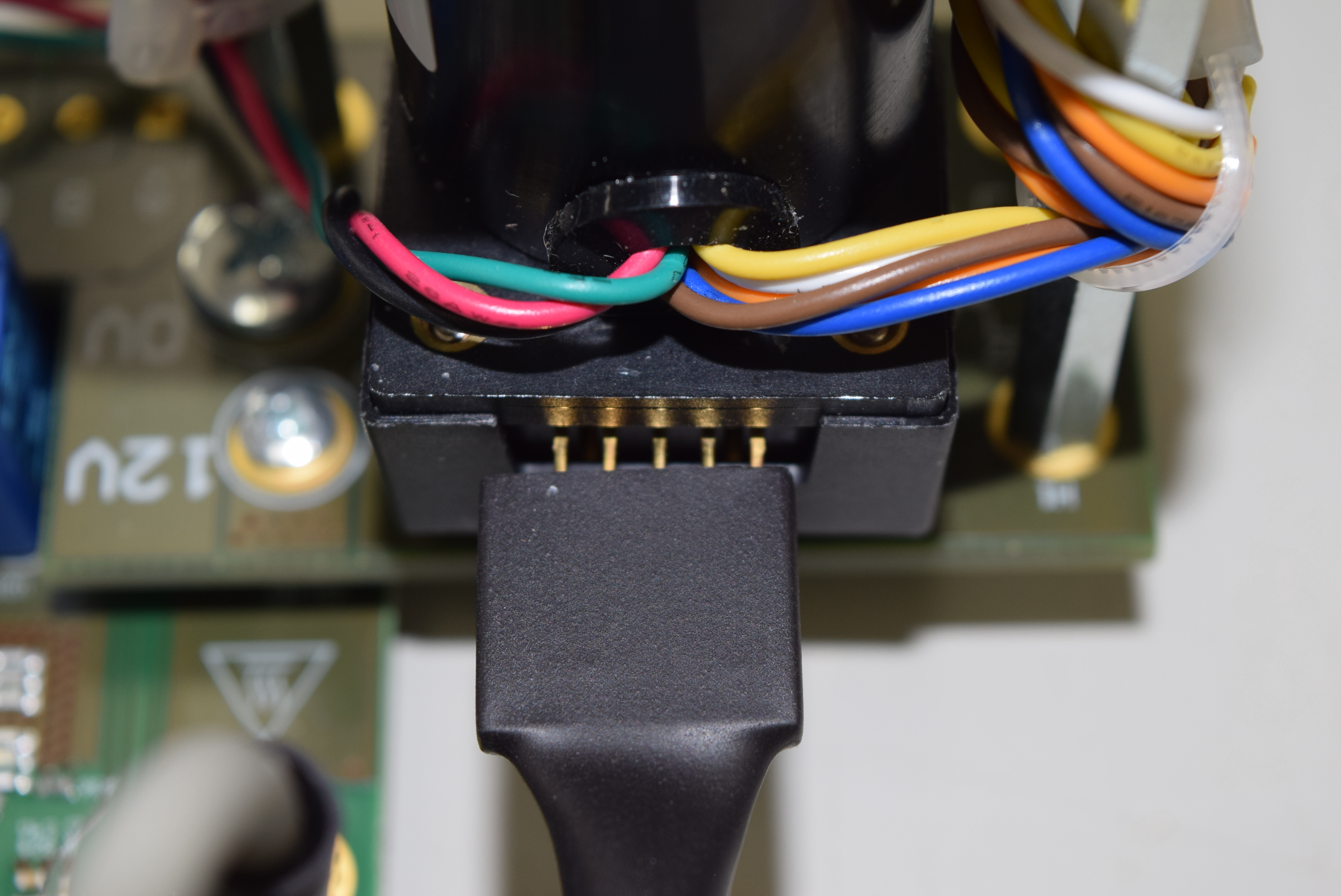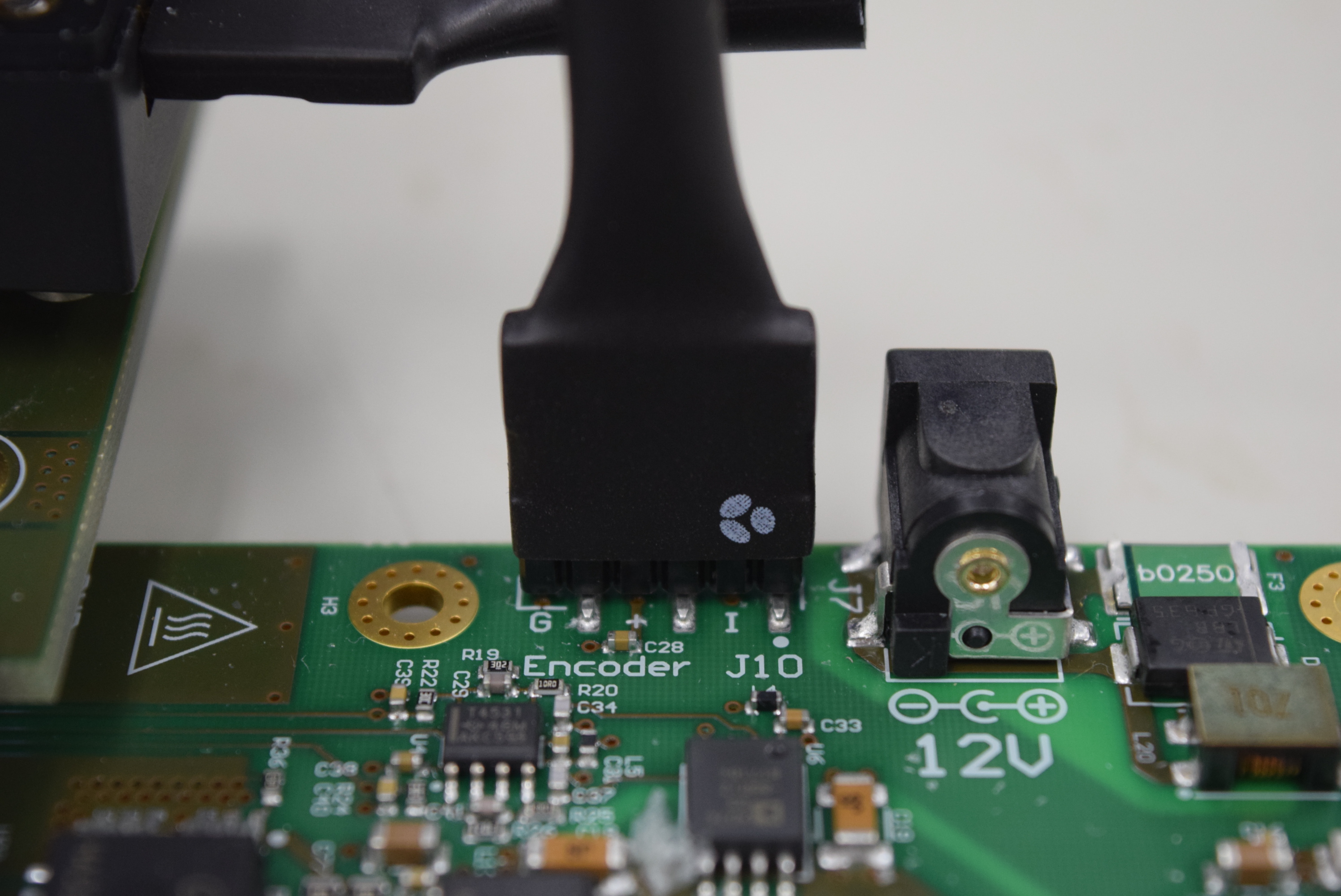 付属のケーブルにはマークがついていて、その位置が1番ピンを表します。ボード側はJ10の端子に接続してください。モーター側は図のように接続します。モーター側の端子は5本しかありませんが、ケーブルの6番ピンが浮いた状態でつなぎます。