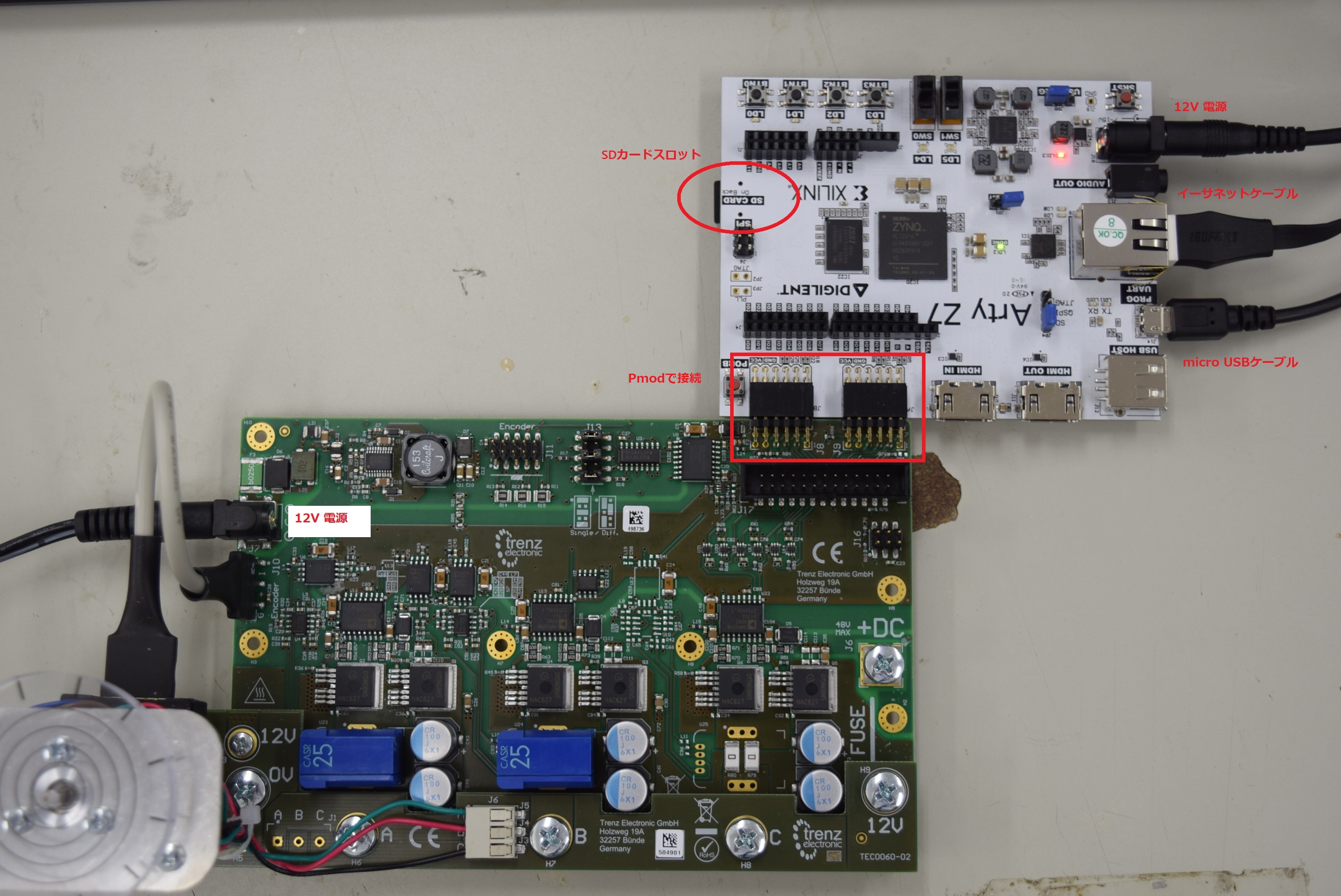 TEC0053モータキットは、3相モーターを駆動・制御するためのセットです。PCからArty上で動作している制御プログラム(C言語とFPGAで作成されている)にアクセスし、モーターの制御を行うことができます。セットには三相モーターのほかに、