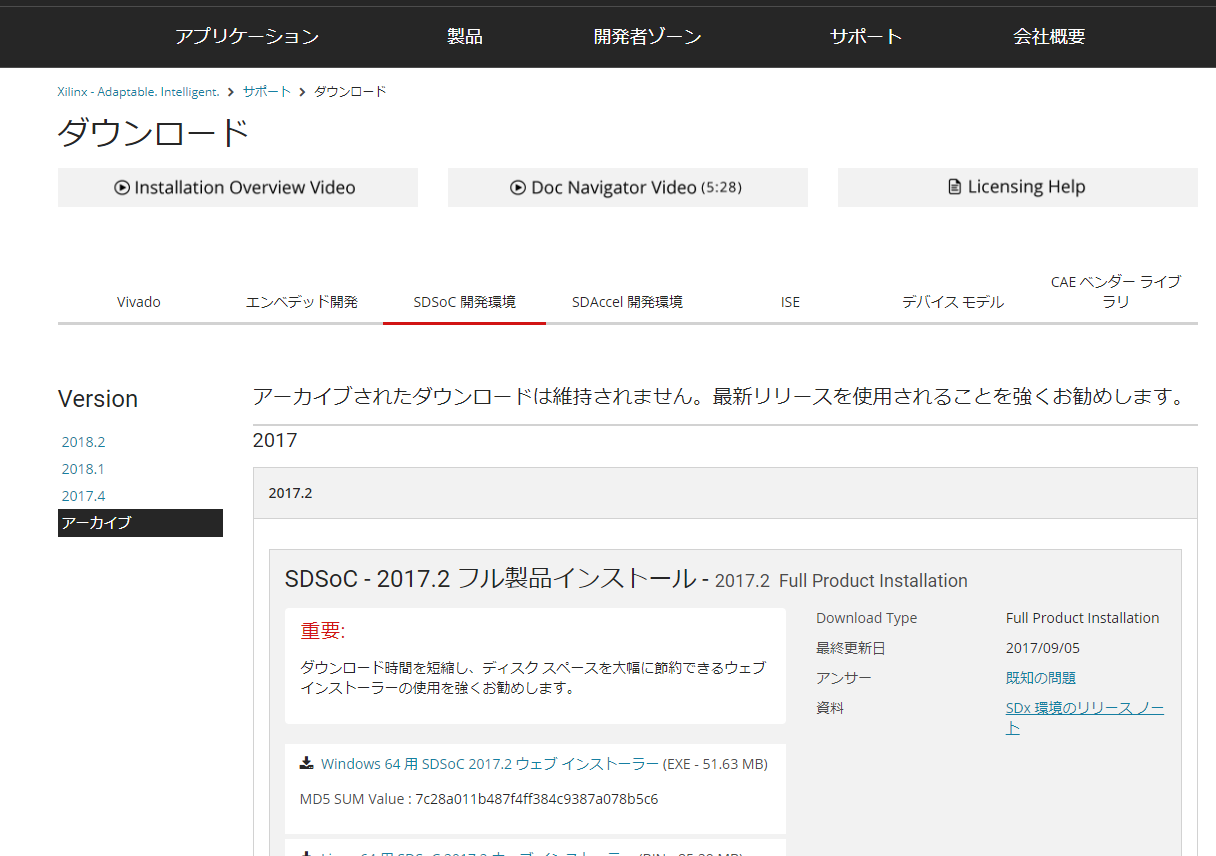 SDSoC 2017.2をダウンロードするには、XILINXのWebサイトから、サポート→ダウンロード→SDSoC開発環境→アーカイブ→2017.2としてダウンロードします。