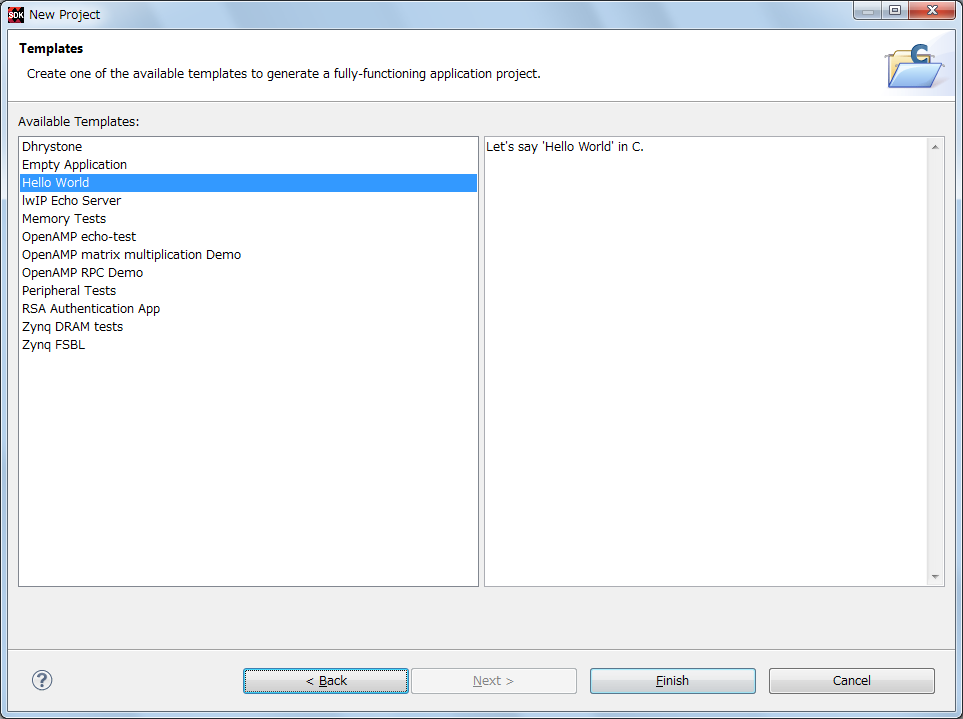 Templates では Hello World を指定し、Finish ボタンを押します。