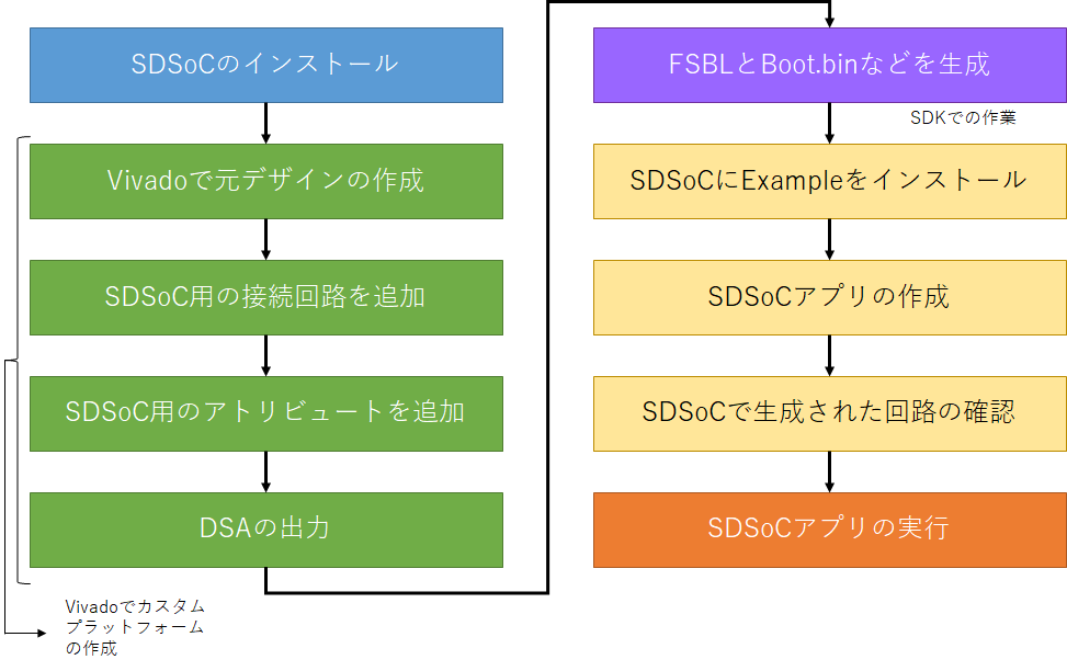 カスタム・プラットフォーム(オリジナルなFPGAボード)でのSDSoCデザインの流れは以下のようになります。