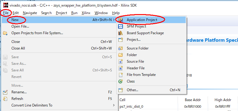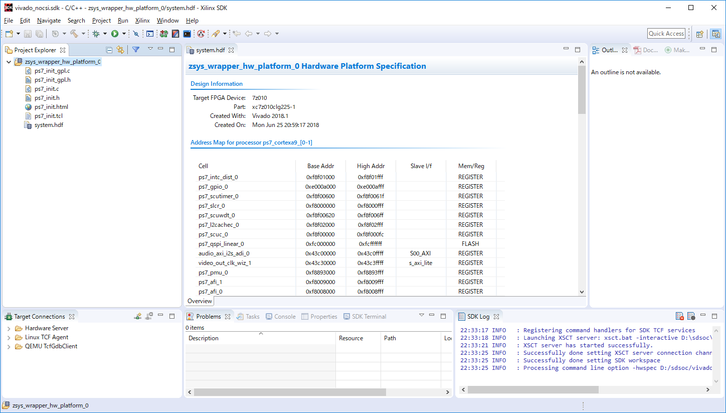 D:\sdsoc\vivado_nocsi\vivado_nocsi.sdk\をワークスペースとして、XILINX SDKが起動します。