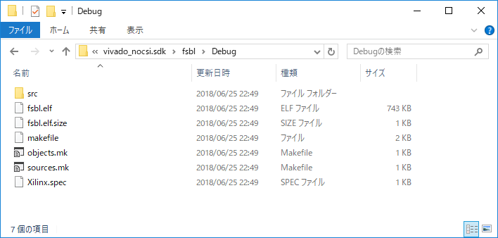 D:\sdsoc\vivado_nocsi\vivado_nocsi.sdk\fsbl\Debugフォルダにfsbl.elfが出来上がっています。