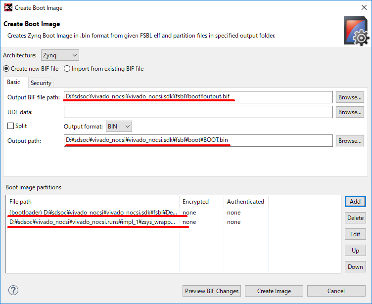 - Output BIF file path: D:\sdsoc\vivado_nocsi\vivado_nocsi.sdk\fsbl\boot
