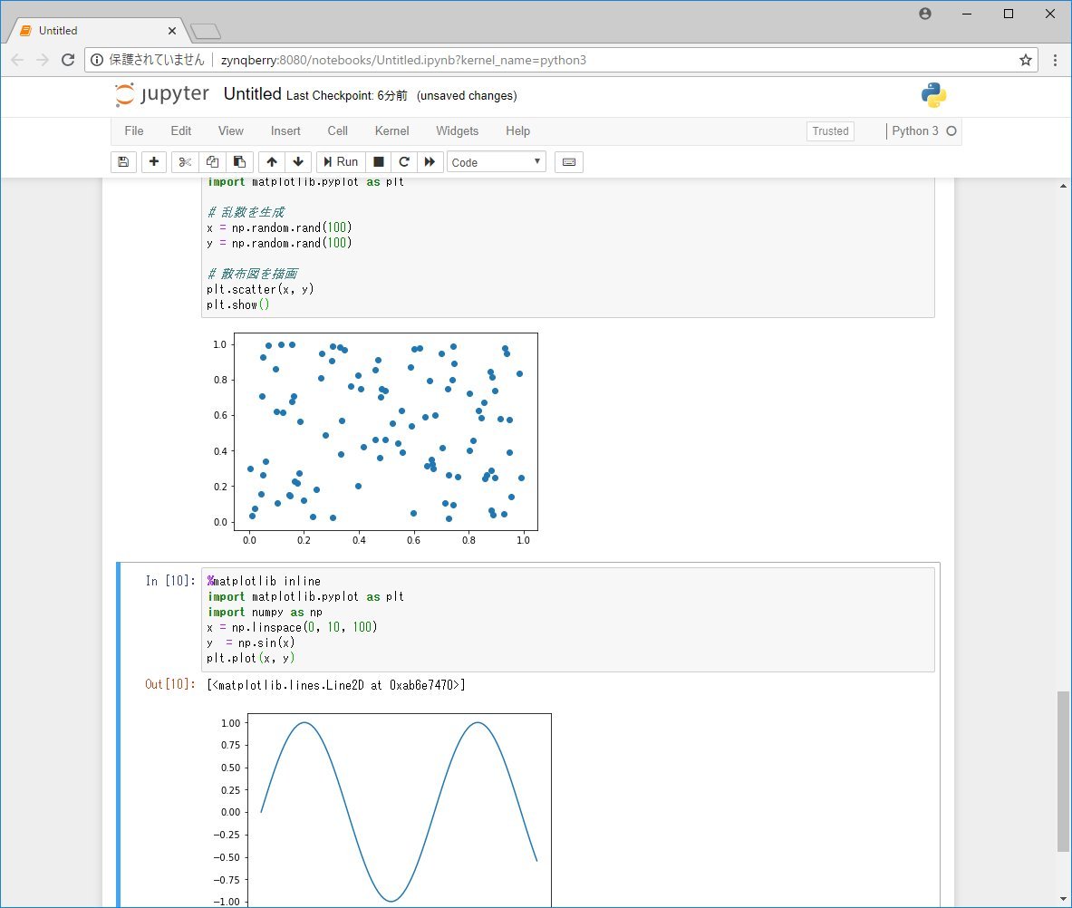 Jupyterを使うと、WebブラウザでZynqberryにアクセスして、任意のPythonのコードを実行したりグラフや絵を描かせてその結果をWebブラウザ上で見ることができます。