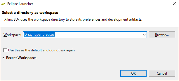 SDSoC 2018.1を起動し、ワークスペースをd:\zynqberry_sdsoc\に設定します。