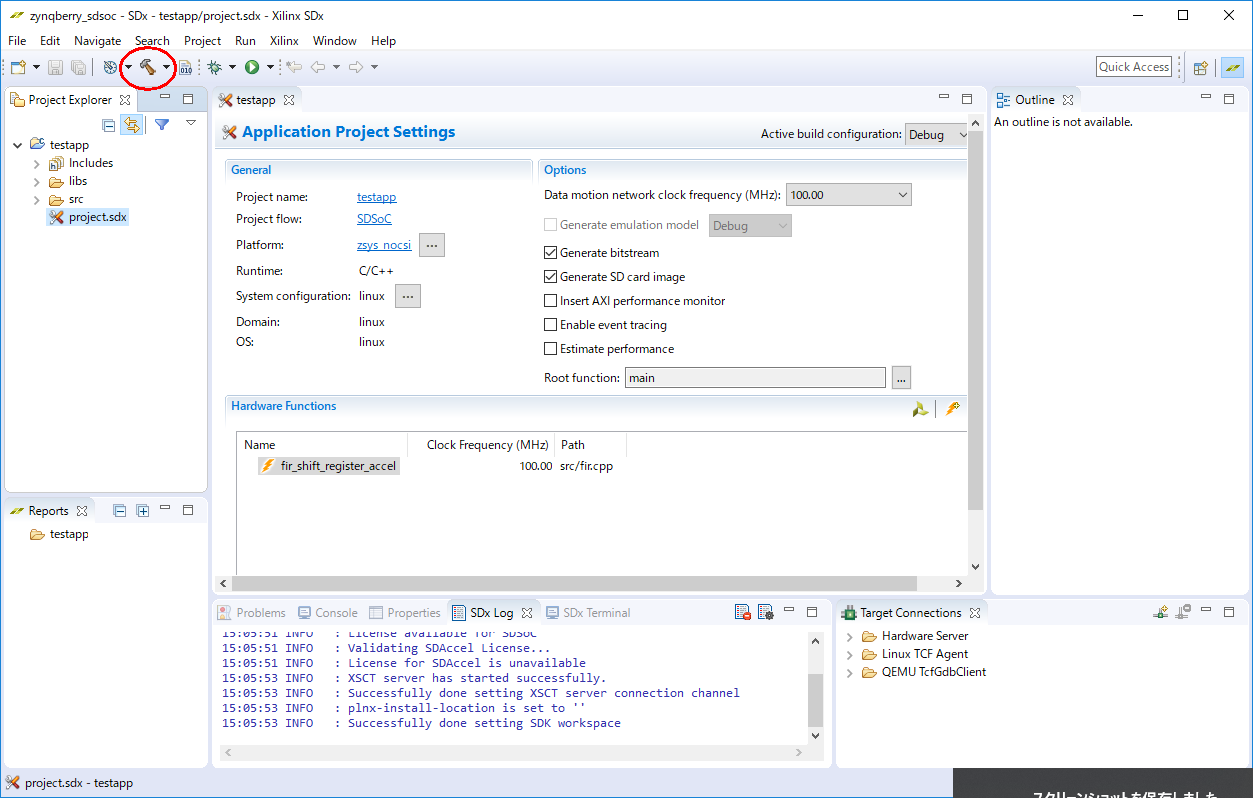 SDSoCのメイン画面に戻ったら、ビルドボタンを押します。