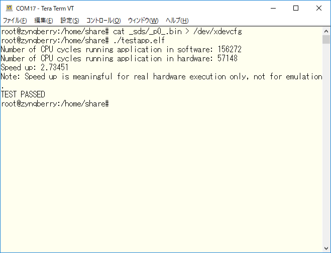 この中の、_sds/_p0_.binとtestapp.elfをコピーして、/dev/xdevcfgを使用してFPGAを書き換え、実行してください。