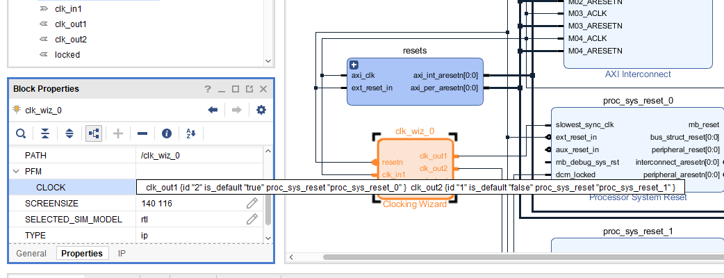 Clocking Wizardなどをクリックして、プロパティを見て、PFM.CLOCKなどが設定されているかどうかを確認してみてください。