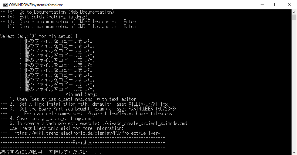 次に、バッチファイルのvivado_create_project_batchmode.cmdか、またはvivado_create_project_guimode.cmdを実行します。どちらも機能は同じで、DOSプロンプトで実行されるか、GUIで実行されるかだけの違いです。