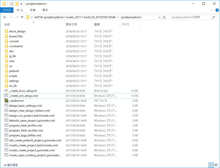 Trenzプロジェクトのzynqberrydemo1をダウンロードし、_create_win_setup.cmdを実行すると、